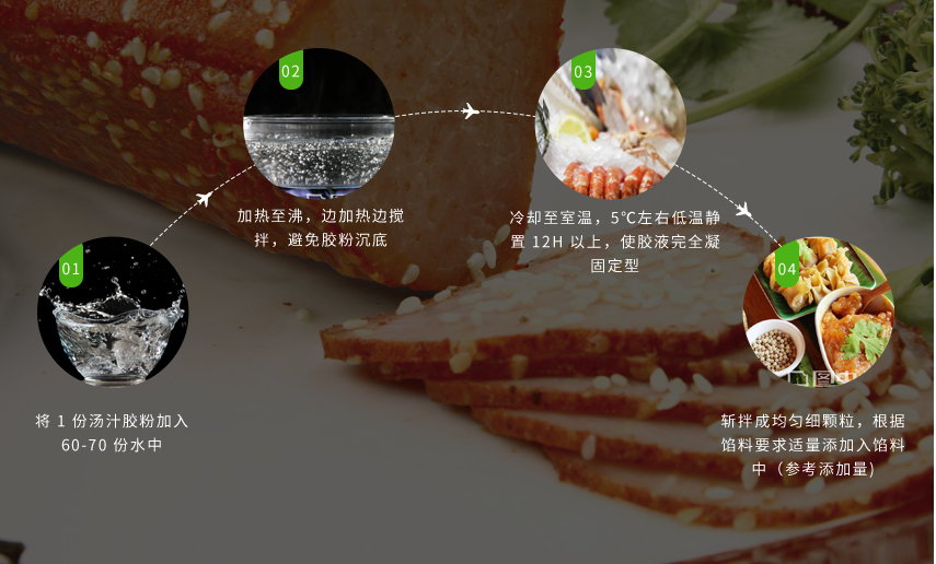 (1)汤汁胶粉兑水比例不宜过高,否则凝胶弱,易出水;